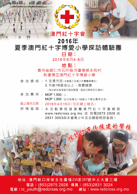 | 詳情查詢: | 可瀏覽澳門紅十字會網頁 www.redcross.org.mo 或 致電28752926或28313003與本會青少年及志願服務部聯繫 | ||||||||||