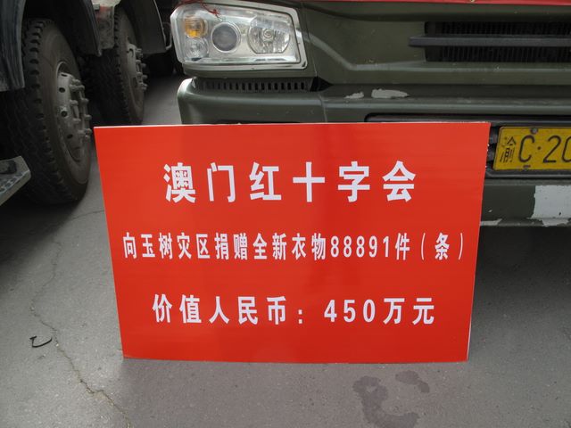 運送衣物車隊抵達青海首府西寧,並由澳門紅十字會主席助理魯凡和賑災事務部主管王毅耘,將這批衣物移交予青海省紅十字會常務副會長尼瑪。 -- 2.jpg