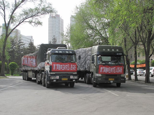 運送衣物車隊抵達青海首府西寧,並由澳門紅十字會主席助理魯凡和賑災事務部主管王毅耘,將這批衣物移交予青海省紅十字會常務副會長尼瑪。 -- 3.jpg