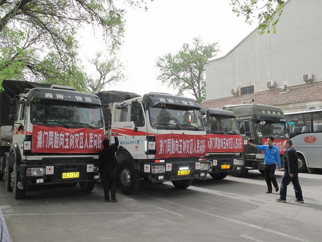 運送衣物車隊抵達青海首府西寧,並由澳門紅十字會主席助理魯凡和賑災事務部主管王毅耘,將這批衣物移交予青海省紅十字會常務副會長尼瑪。 -- 4.jpg