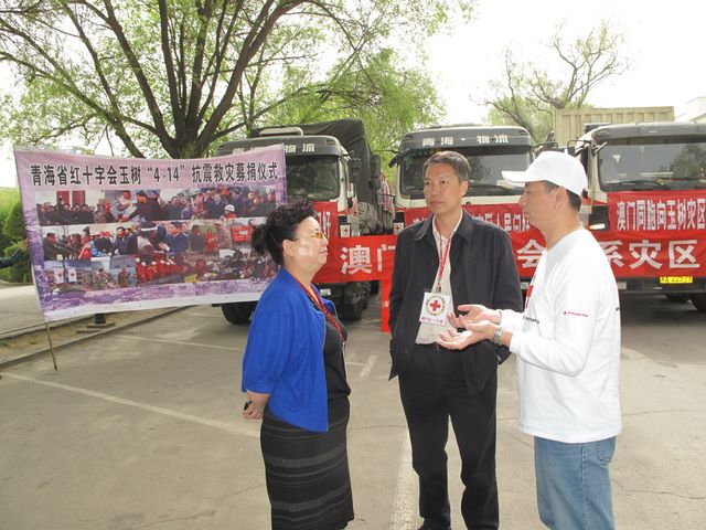 運送衣物車隊抵達青海首府西寧,並由澳門紅十字會主席助理魯凡和賑災事務部主管王毅耘,將這批衣物移交予青海省紅十字會常務副會長尼瑪。 -- 5.jpg