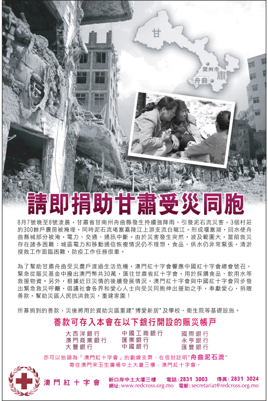 澳門紅十字會向全澳巿民呼籲捐助甘肅受災同胞