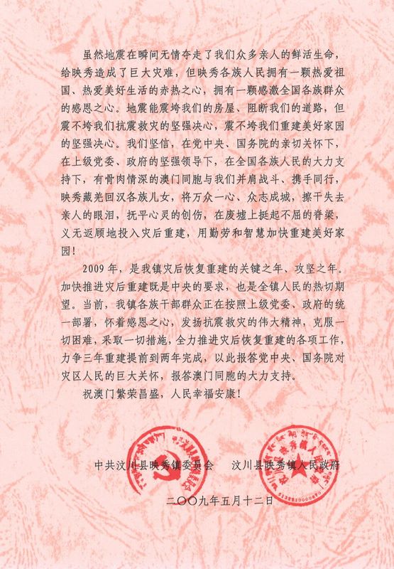Letters of Thanks from Yingxiu Township and Jiang You Township of Sichuan. -- 20090417165323_00001.jpg