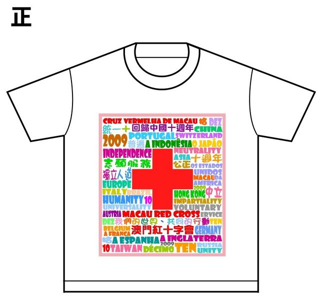設計理念:圖案由密鋪文字以及十字組成,大大的紅色十字,讓人一看便聯想出這是紅十字會的T裇。密鋪的文字有3種語言,中文、英文和葡文,文字表達了紅十字會的精神,以及有不同國家地區的名稱,表示了紅十字會在世界各地的設立,一方有難,八方支援,亦帶出這次比賽的主題“我們的世界,共同的行動”。