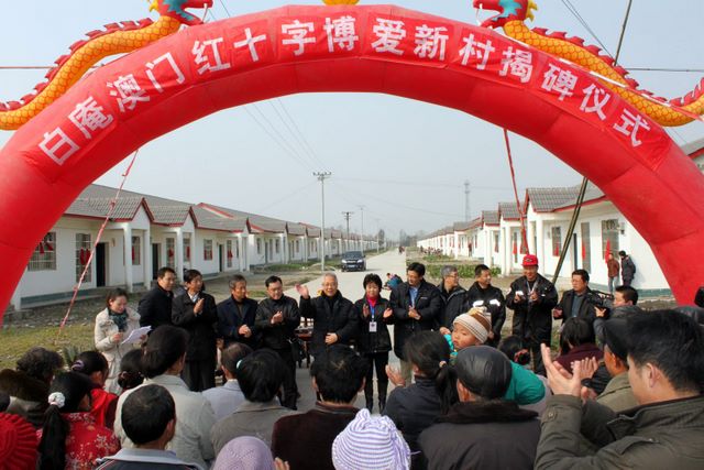 2010/1/24 Mr. Eddie, Wong Yue-Kai President of the Central Council, Mr. Lau Veng-Lin, Central Council member, Dr. Philip, Chou Kuok-Hei, President and Mr. Quin Va, Vice President of the Directive Council of Macau Red Cross, joined by Mr. Paul, Lei Cheok-Kuan, Vice Director of the União Gerald as Associações dos Moradores de Macau to officiate the moving-in ceremony of the Macau Red Cross Fraternity Village at Tashui township, Anxian of Sichuan province.