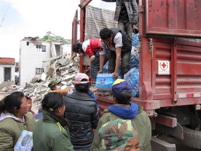 2010/5/3 The special convoy carrying relief materials acquired by Macau Red Cross in Xining, Qinghai has arrived in Yushu. Truckloads of food, clothing and personal hygiene items were immediately distributed to some 400 students of the Yushu Orphanage School. -- 4.jpg