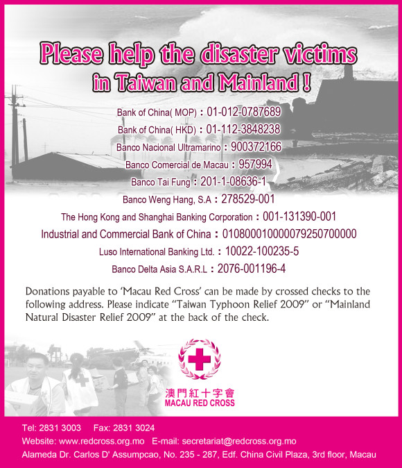 indicate "Taiwan Typhoon Relief 2009" or "Mainland Natural