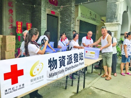 去年“天鴿”後,澳門銀河娛樂集團基金會與澳紅會就本地備災計劃展 開合作,捐款設立備災倉庫、購置救災設備和物資等。今次在“山竹”過後有關備災計劃立即發揮作 用,澳紅會義工與該基金會義工聯同街坊總會代表分別在下環街區及康公廟區,向受影響的巿民派發 了五百個家庭應急箱,總值十七萬元,箱內含應急日常生活用品,可解巿民燃眉之急。