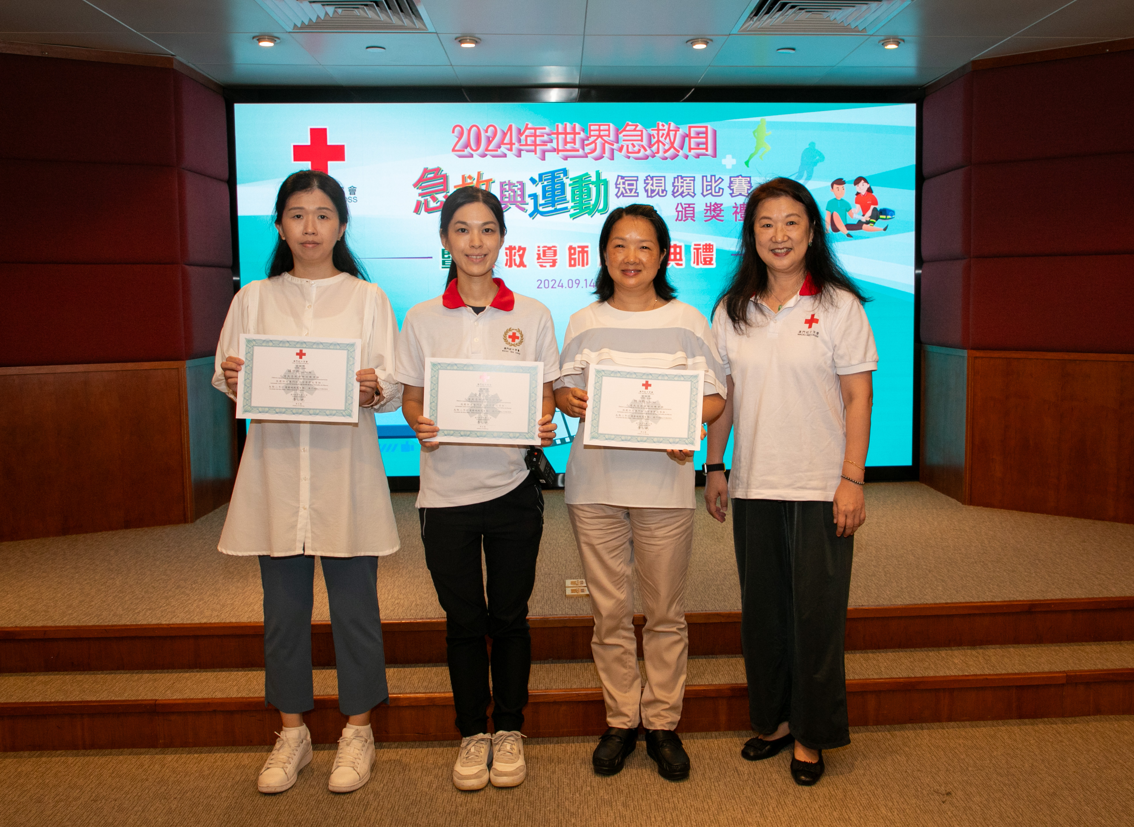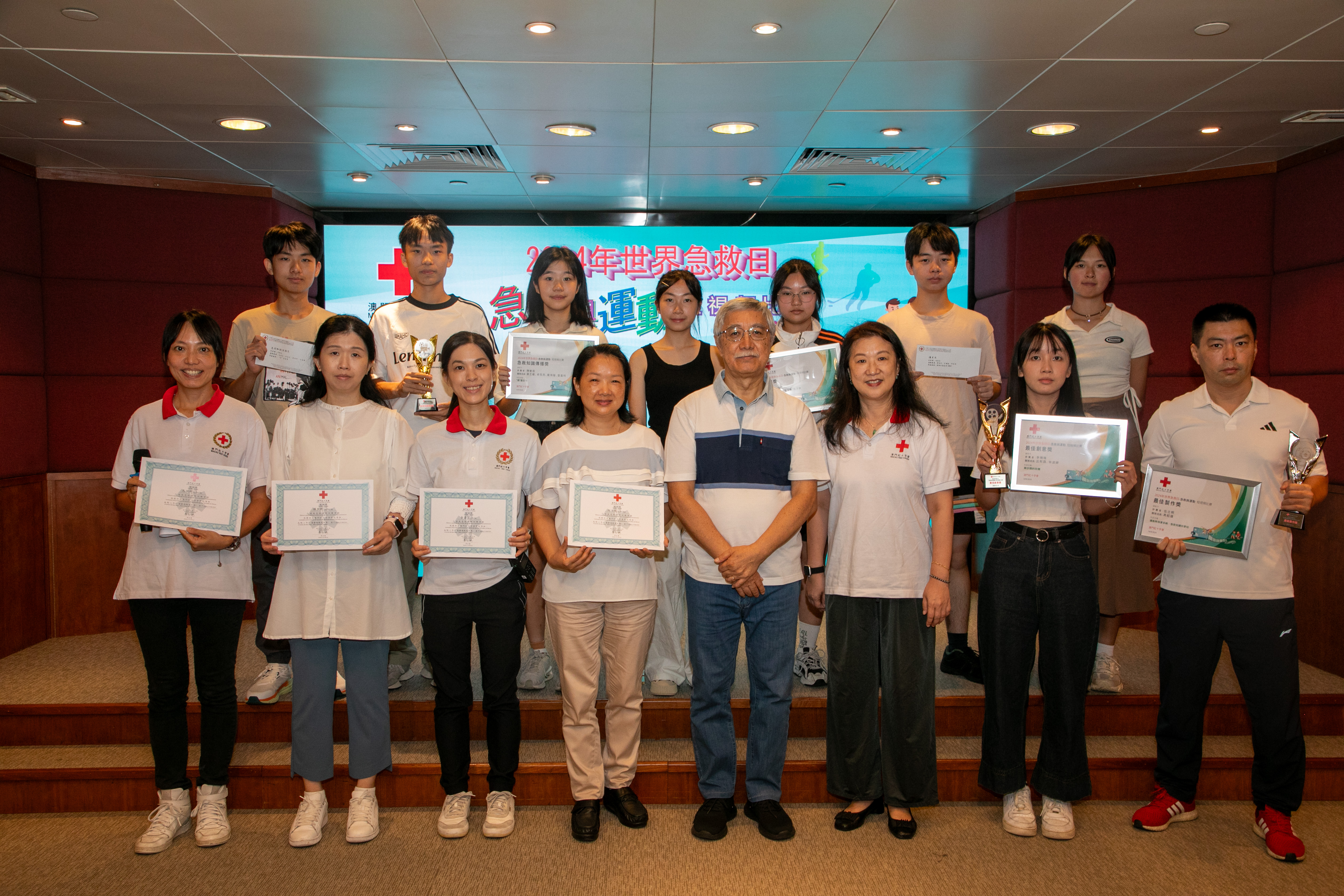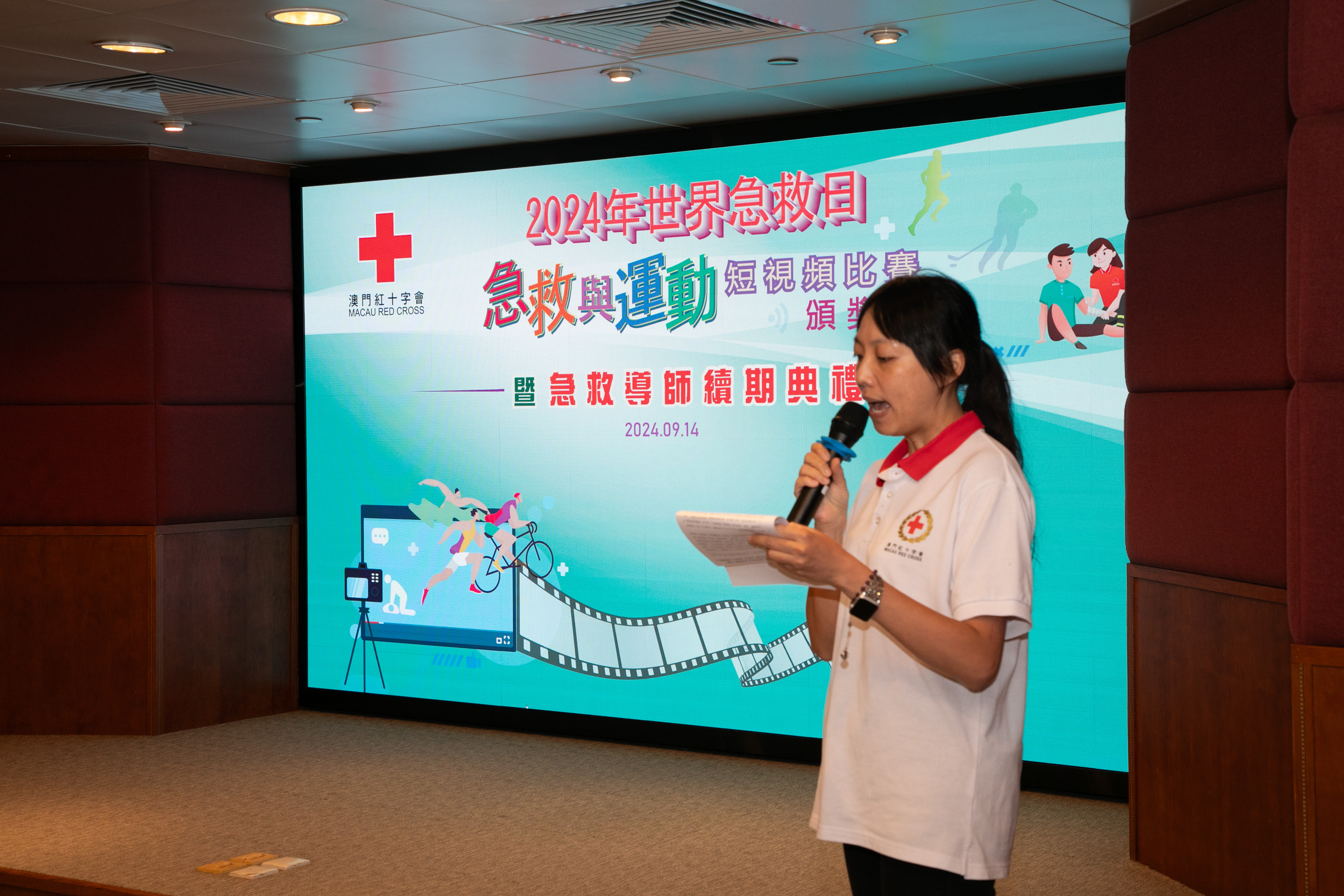 每年9月的第二個星期六是「世界急救日」,各國紅十字會、紅新月會都會舉辦各種活動來紀念這一天,希望透過活動呼籲各國重視急救知識的普及,讓更多的人認識急救、掌握急救,當有意外發生時都可以用急救技能挽救生命將傷害減低。今年「世界急救日」的主題是「First Aid and Sports急救與運動」,澳門紅十字會特別舉辦以“急救與運動”為主題的短視頻比賽,並於9月14日世界急救日當天在澳門紅十字會總辦事處,舉行了“2024年世界急救日短視頻比賽頒獎禮”,同場亦為急救導師頒發了續期證書,澳紅會理事長馬健華參加了典禮並為獲獎者頒獎。