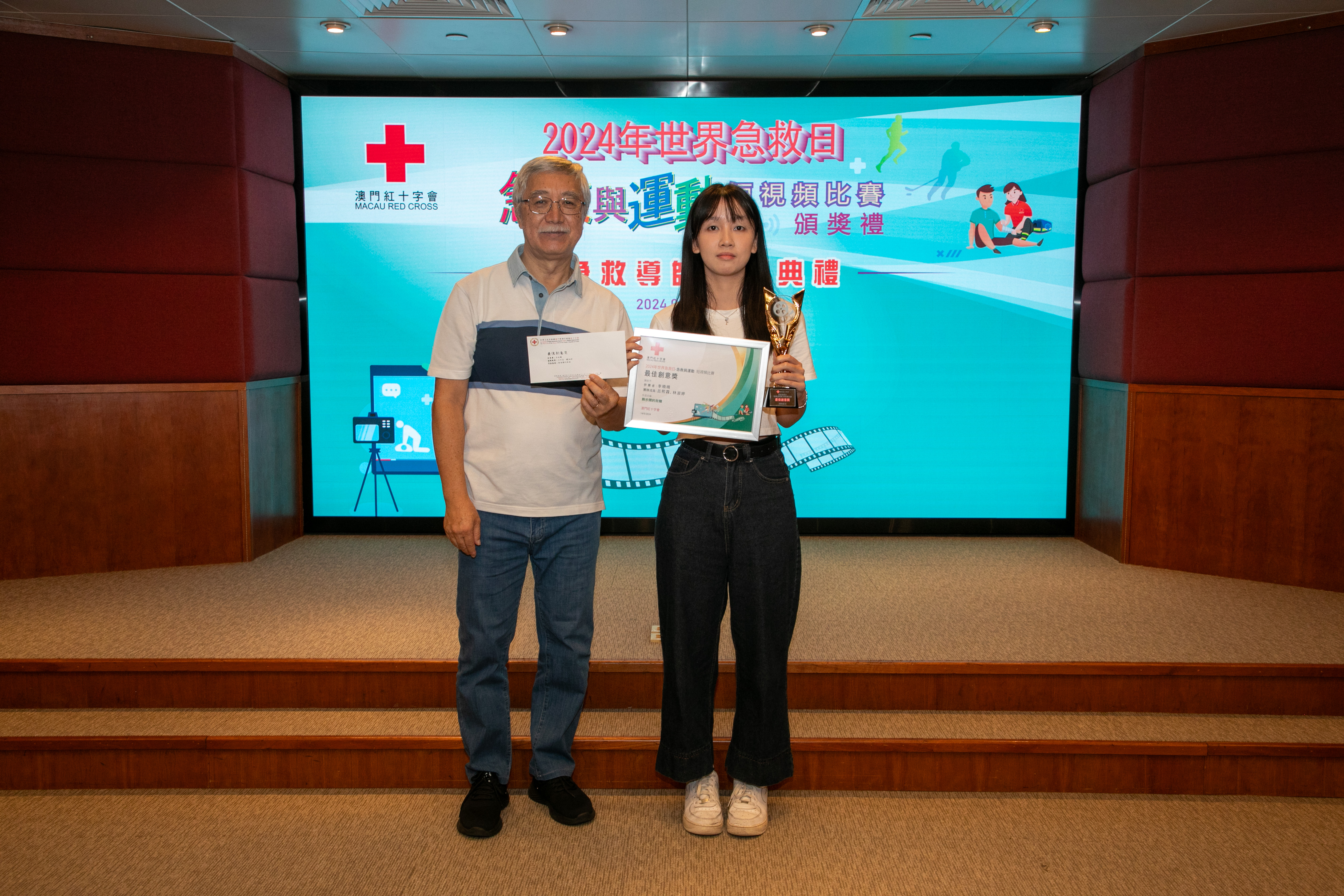 在頒獎禮上,澳門紅十字會理事長馬健華為這五份獲獎作品的創作者頒發了紀念獎座、榮譽證書及獎品,對得獎者的創意和努力表示了高度肯定。其後澳門紅十字會學校校長宋文珠向合資格的急救導師頒發續期證書,對急救導師長期以來在急救培訓方面作出的貢獻表示了衷心感謝。儀式結束後,參加者共同欣賞了獲獎的短視頻作品,大家在歡笑中加深了對急救知識的理解與記憶。