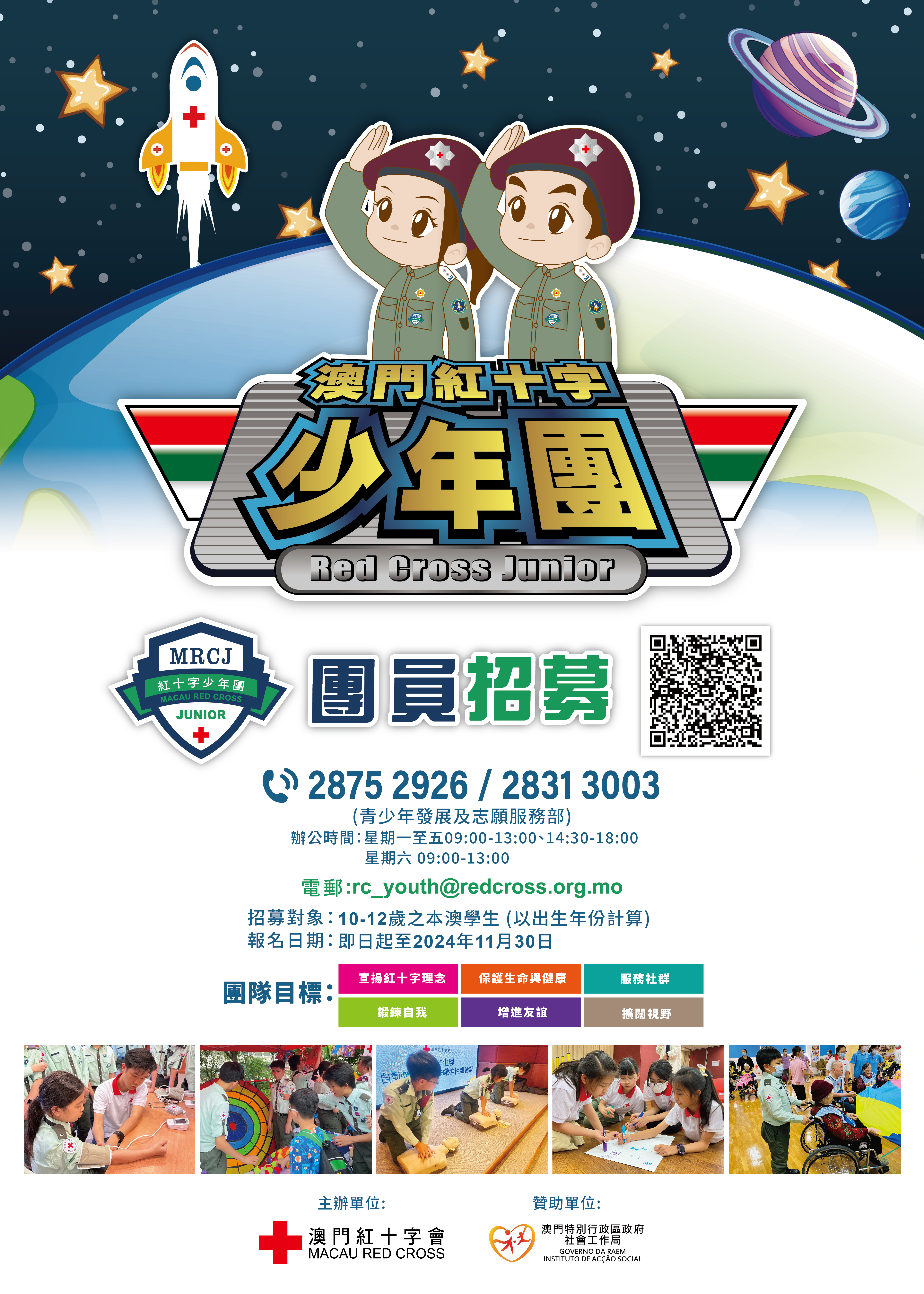 | 報名手續: | 即日起至11月30日前,瀏覽澳門紅十字會網頁www.redcross.org.mo,登入「少年團招募團員」報名連結,或宣傳海報QR CODE,填寫資料即可。 面試日期: 12月28及29日 面試地點: 澳門紅十字會總辦事處(新口岸宋玉生廣場255-263號中土大廈三樓) 辦公時間: 星期一至五09:00-13:00,14:30-18:00;星期六09:00-13:00 查詢:請於辦公時間致電2875 2926 / 2831 3003與青少年發展及志願服務部李小姐或楊先生聯繫 |