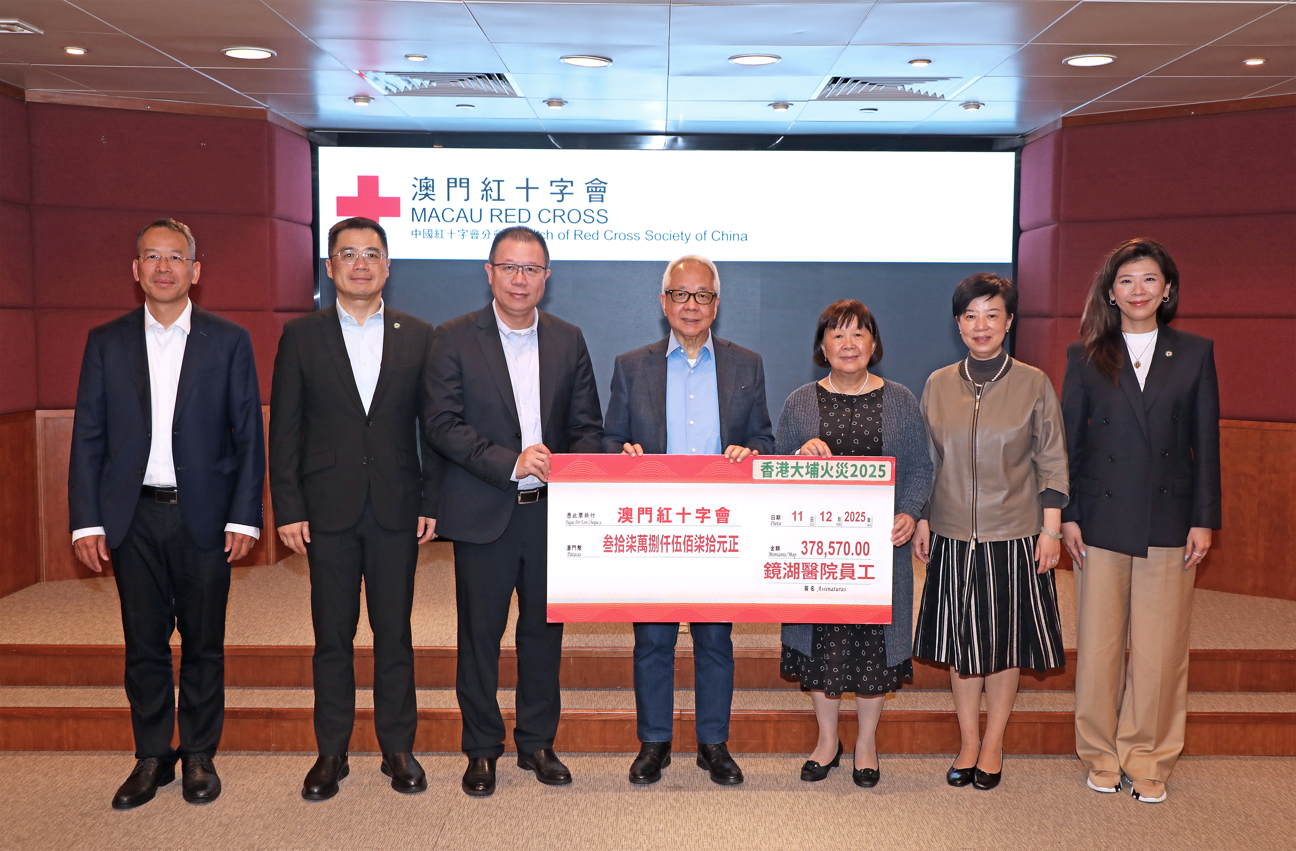 鏡湖醫院慈善會副主席兼秘書長吳培娟、鏡湖醫院院長李鹏斌、院長助理祁维、何敬全代表鏡湖醫院員工向該會捐出378,570澳門元。