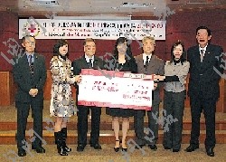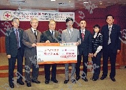 昨日下午四時半,澳門紅十字會先後收到澳門電訊有限公司員工及公司捐款廿五萬澳門元、金龍電器超級市場有限公司捐款十萬澳門元、利嘉閣(澳門)地產有限公司捐款三萬八千澳門元,由紅會副理事長兼義務司庫馬健華、中央委員會委員兼禮賓司王清軒、中央委員會委員李松佳及總監麥柱流代表接收。