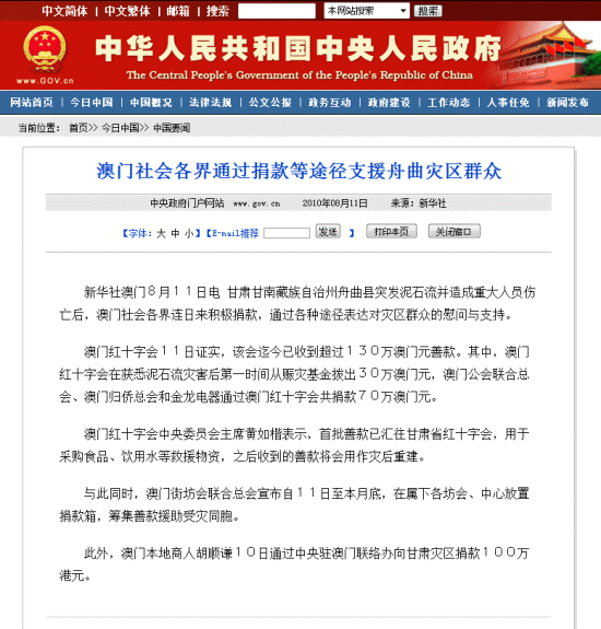 澳門社會各界通過捐款等途徑支援舟曲災區群眾