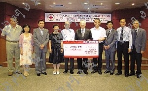 昨日下午三時至三時半,六商企、慈善團體及個人先後前往澳門紅十字會送交善款,包括鏡湖醫院慈善會及鏡湖醫院員工五十萬元,大豐銀行有限公司二十萬元,澳門中華總商會副會長廖澤雲、同善堂值理會仝人、澳門電訊有限公司、澳門當押業總商會各十萬元,梁披雲家屬五萬元,並由紅十字會中央委員會主席黃如楷,委員兼義務秘書吳川柱,委員兼禮賓司劉永年,委員何萬昌,總監麥柱流代表接收。