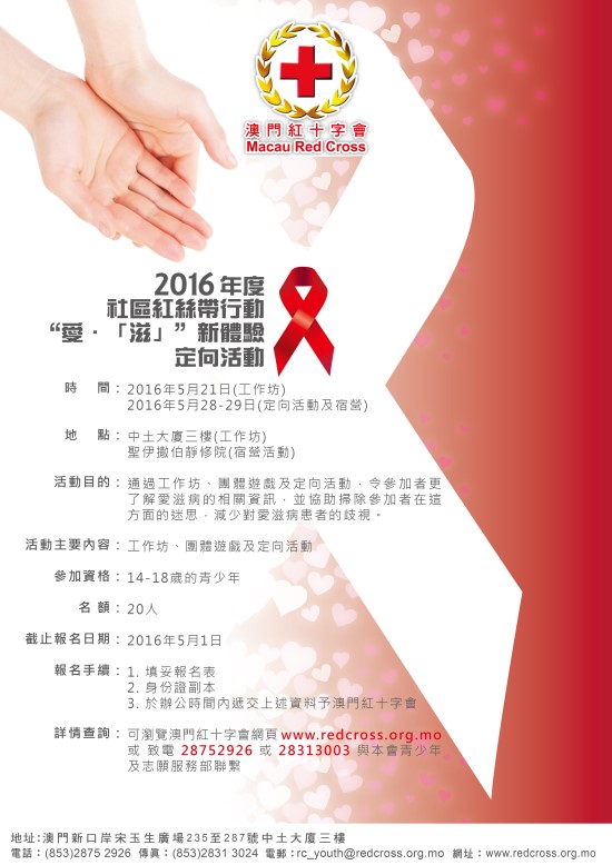 | 詳情查詢: | 可瀏覽澳門紅十字會網頁 www.redcross.org.mo 或 致電28752926或28313003與本會青少年及志願服務部聯繫 | ||||||||